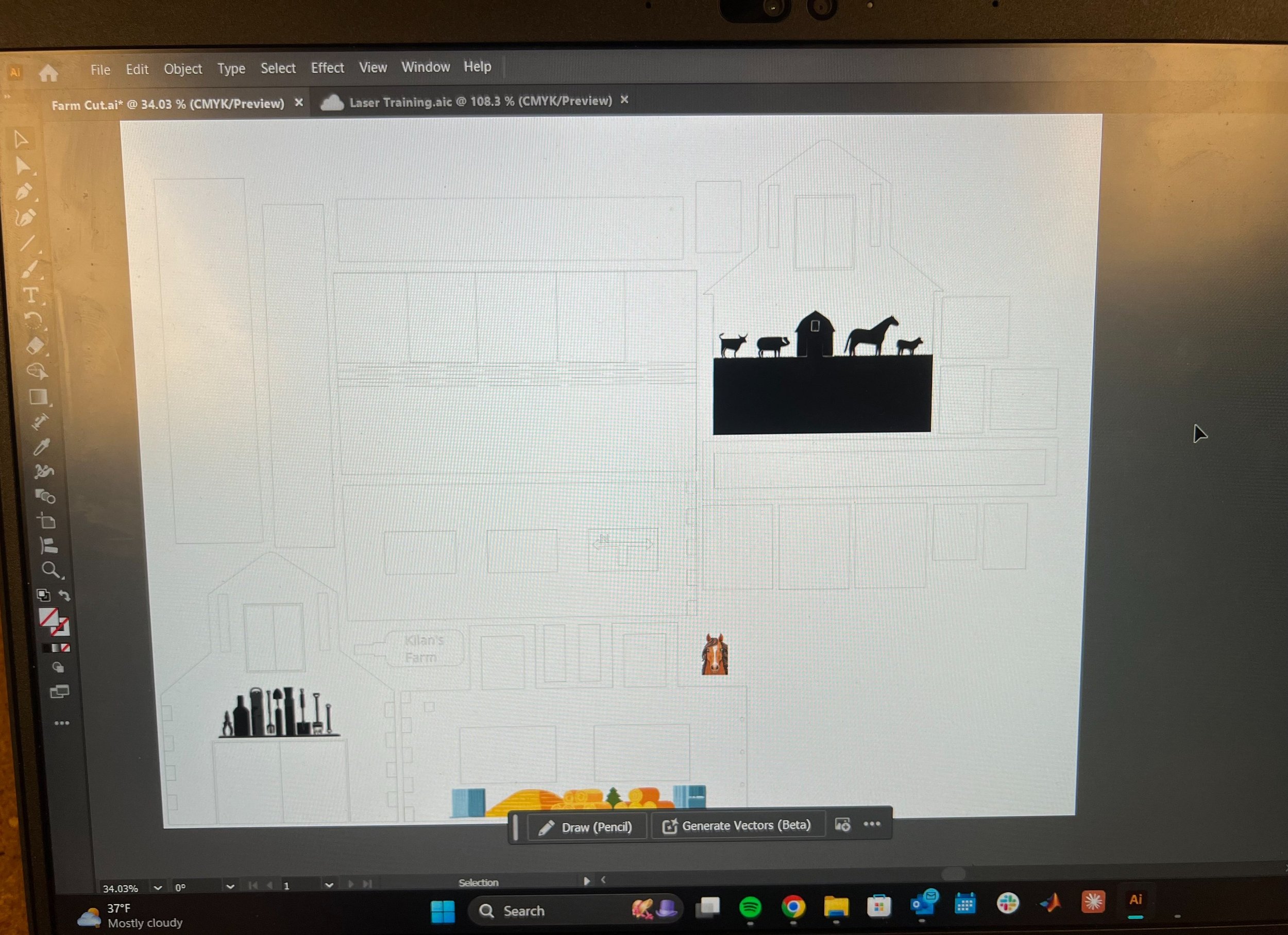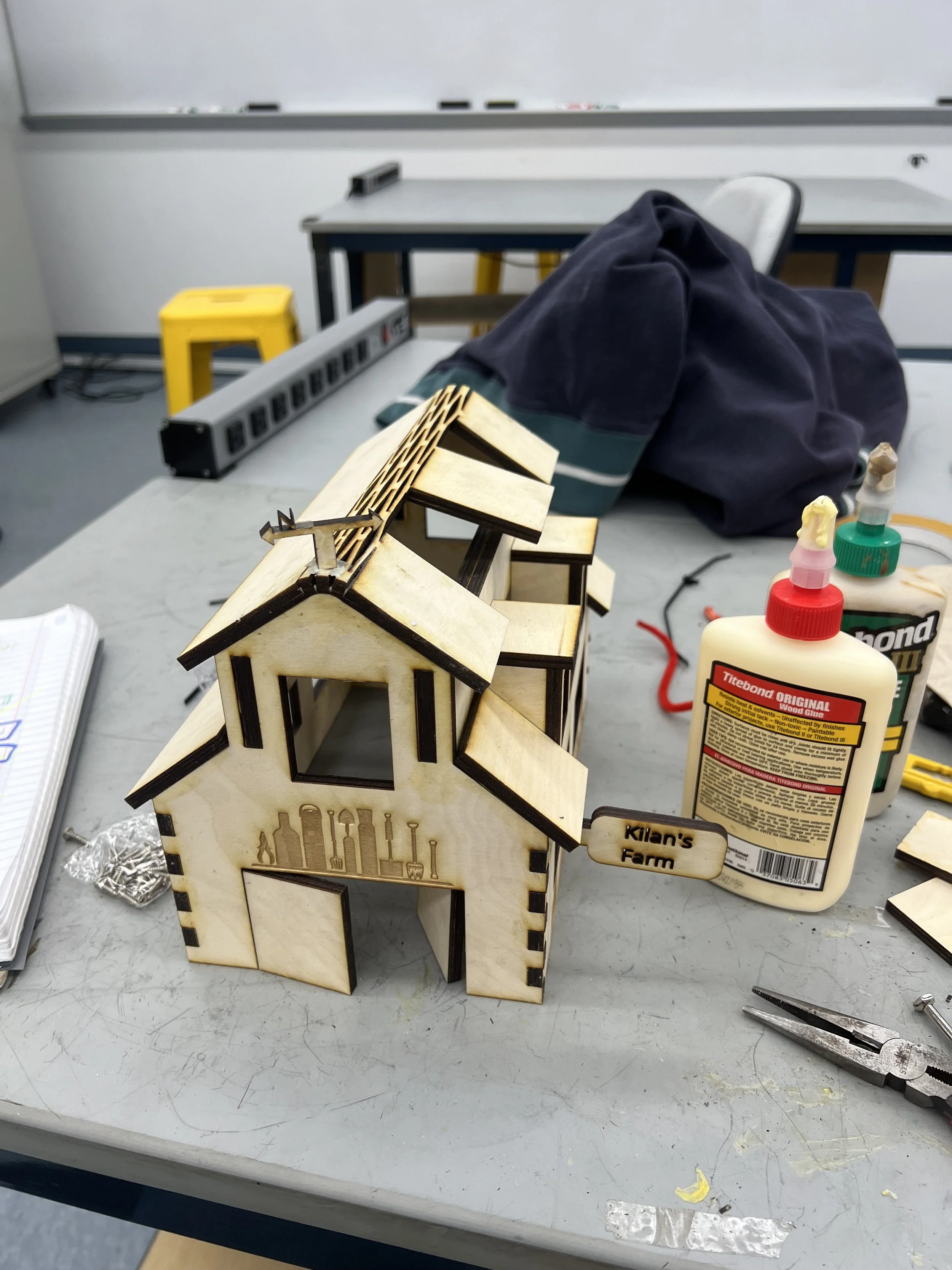Solution: Created a model and then nested the sketches in Adobe Illustrator to ensure maximized material usage. (The barn ended up being bigger than the material, so I had to reduce its overall size thanks to the CAD being entirely based on equations)