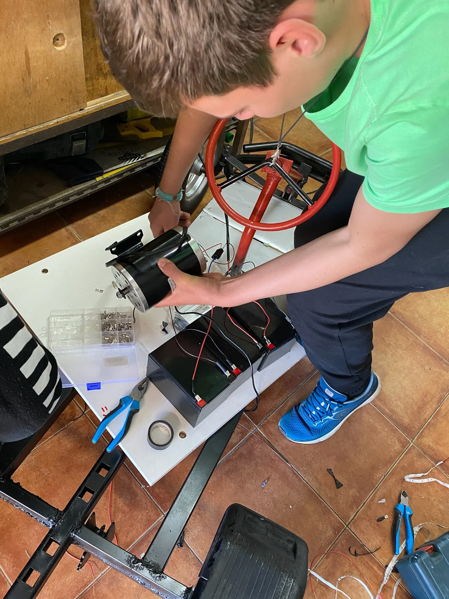 During the COVID-19 quarantine, I undertook a project to convert a pedal go-kart into an electric vehicle. Working alongside a friend who was building his own version, I focused on sustainability by repurposing discarded batteries and sourcing electronics from a local Spanish scooter manufacturer. The project combined mechanical engineering, electrical systems, and custom fabrication to create a fully functional electric go-kart.